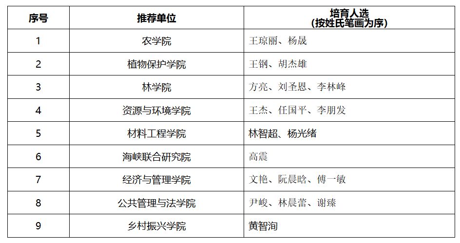 根据《bat365正版唯一官网新时代高层次人才“双百计划”实施方案(试行)》(闽农林大人〔2023〕3号)精神,经个人自由申报,学院审核把关,科技处、社会科学处形式审查,专家评审推荐,学校研究,产生2025年“百人攀登计划”培育人选20名,其中自然科学13人、社会科学7人。现将名单公示如下: