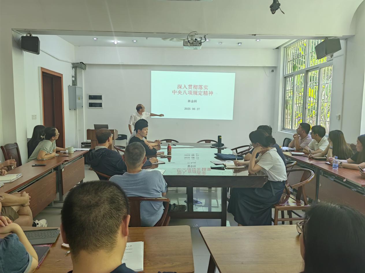 林金科为全院教职工讲授深入贯彻中央八项规定精神学习教育专题党课。他结合《党政机关厉行节约反对浪费条例》出台背景,重点解读了经费管理、国内差旅、因公临时出国(境)、公务接待、公务用车、会议活动、办公用房、资源节约等条款。他强调,贯彻执行《党政机关厉行节约反对浪费条例》各项规定,既是深入学习贯彻习近平总书记关于“过紧日子”重要指示精神的具体行动,也是推动作风建设、保障学院事业高质量发展的必然要求,全体党员要切实增强“过紧日子”意识,主动带头“过紧日子”,在厉行节约、反对浪费上走在前、作表率。