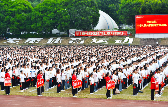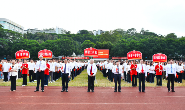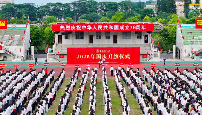 10月1日清晨,bat365在福州仓山校区、福州大学城校区、泉州安溪校区和南平校区同步举行升国旗仪式,热烈庆祝中华人民共和国成立76周年。校党委书记赖海榕,校长兰思仁,校党委副书记陈世奎、曾华平,副校长郑宝东、唐振鹏、周顺桂,校纪委书记陈艳出席活动。全体中层干部、校区校园办干部、政工干部、管理干部和各学院学生代表共五千余人参加。升国旗仪式由曾华平主持。