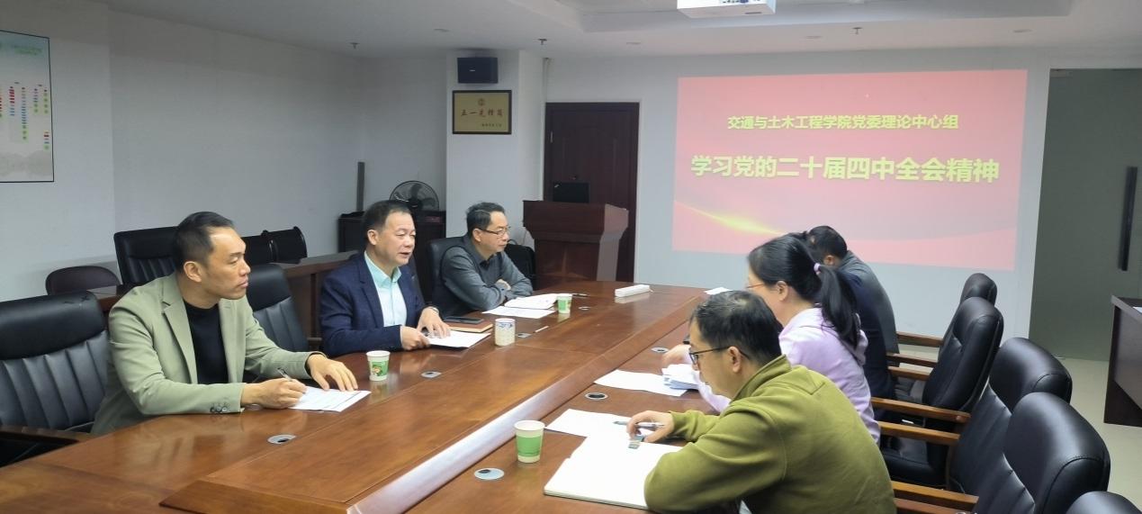 11月24日上午,交通与土木工程学院党委在大学城校区仁德楼501会议室召开理论学习中心组学习会,专题学习党的二十届四中全会精神。学院党委理论学习中心组成员参加学习,会议由学院党委书记陈为德主持。