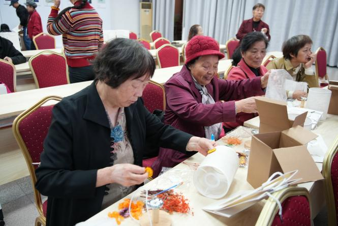 活动互动环节中,聚焦金融防诈主题和健康养生需求,特别设置了手作台灯环节,老同志们在手工老师的引导下将干花粘贴在圆柱形台灯外壳上,设计出形态多样的图案,喻意“识诈反诈,灯映初心”,进一步强化防诈意识,传递健康关怀。