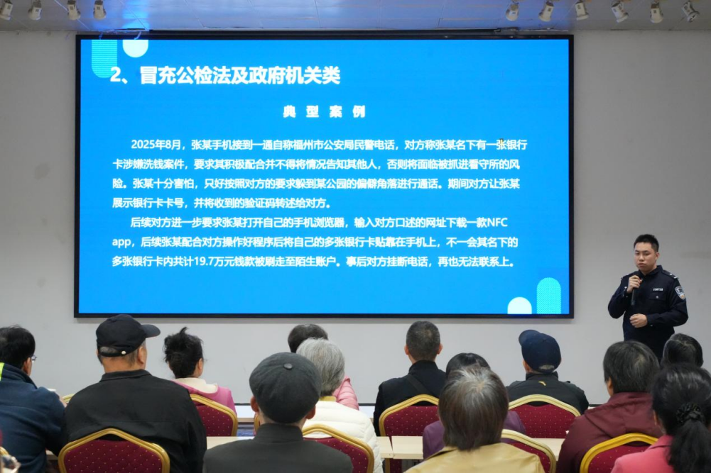针对退休老同志特点,福州市公安局仓山分局刑侦大队黄冠中警官从“什么是电信网络诈骗、常见诈骗套路、识别防范网络诈骗”三个方面入手,采用真实案例拆解+情景模拟教学的形式,与老同志们分享了当下高发的诈骗手段和类型,并反复叮嘱老同志要时刻保持警惕,牢记十个“凡是”和“不听、不信、不转账”的原则,遇事多与子女沟通或立即报警,守好自己的“养老钱”。