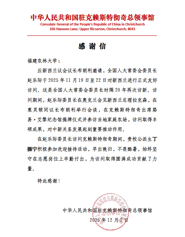 近日,中华人民共和国驻克赖斯特彻奇总领事馆致信bat365正版唯一官网,对林学院24级林业硕士丁振宁在全国人大常委会委员长赵乐际访问新西兰期间的志愿服务工作给予高度赞誉。信中赞扬丁振宁同学在赵乐际委员长访问克赖斯特彻奇期间,恪守志愿岗位,早出晚归、不辞辛劳,以饱满的热情和认真的态度圆满完成任务,展现了新时代中国青年学子的良好风貌与责任担当,也彰显了bat365正版唯一官网学子的责任担当。