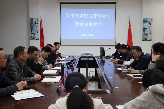 为进一步推进校园安全稳定工作,发挥警校联动的协同保障作用,2025年12月5日,泉州安溪校区在怀德楼215会议室召开警校联动安全稳定专题工作会议。泉州安溪校区校园办主任黄成茂、副主任张云帆、陈勇、洪涛、参内镇派出所所长许志伟、副所长陈俊杰、林东航、校区警务中心负责人林松辉、社区民警肖远鹏以及校区全体辅导员参加会议。会议由校园办保卫科科长马家峰主持。