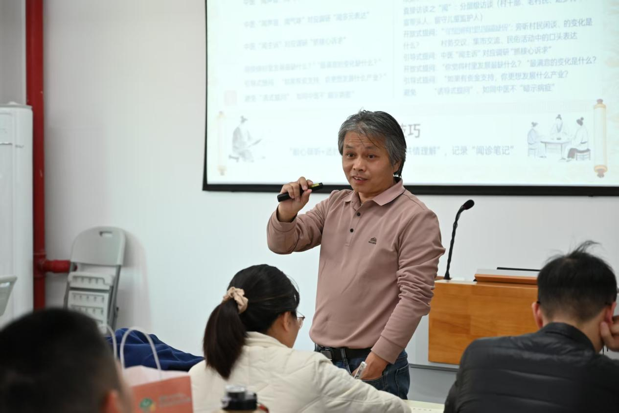 培训会上,邱建生以中医“望闻问切”为喻,生动讲解了乡村问卷调研的方法与技巧。他强调,调研工作必须紧密贴合乡村实际,真诚倾听村民心声,设计具有针对性的问题,并对数据进行精准分析,使问卷真正成为连接高校智慧与乡村发展需求的桥梁。邱建生还提醒同学们,应怀抱服务基层之心投入实践,通过精心设计互动游戏、团建活动等“小心思”,更快拉近与村民的距离,建立信任。