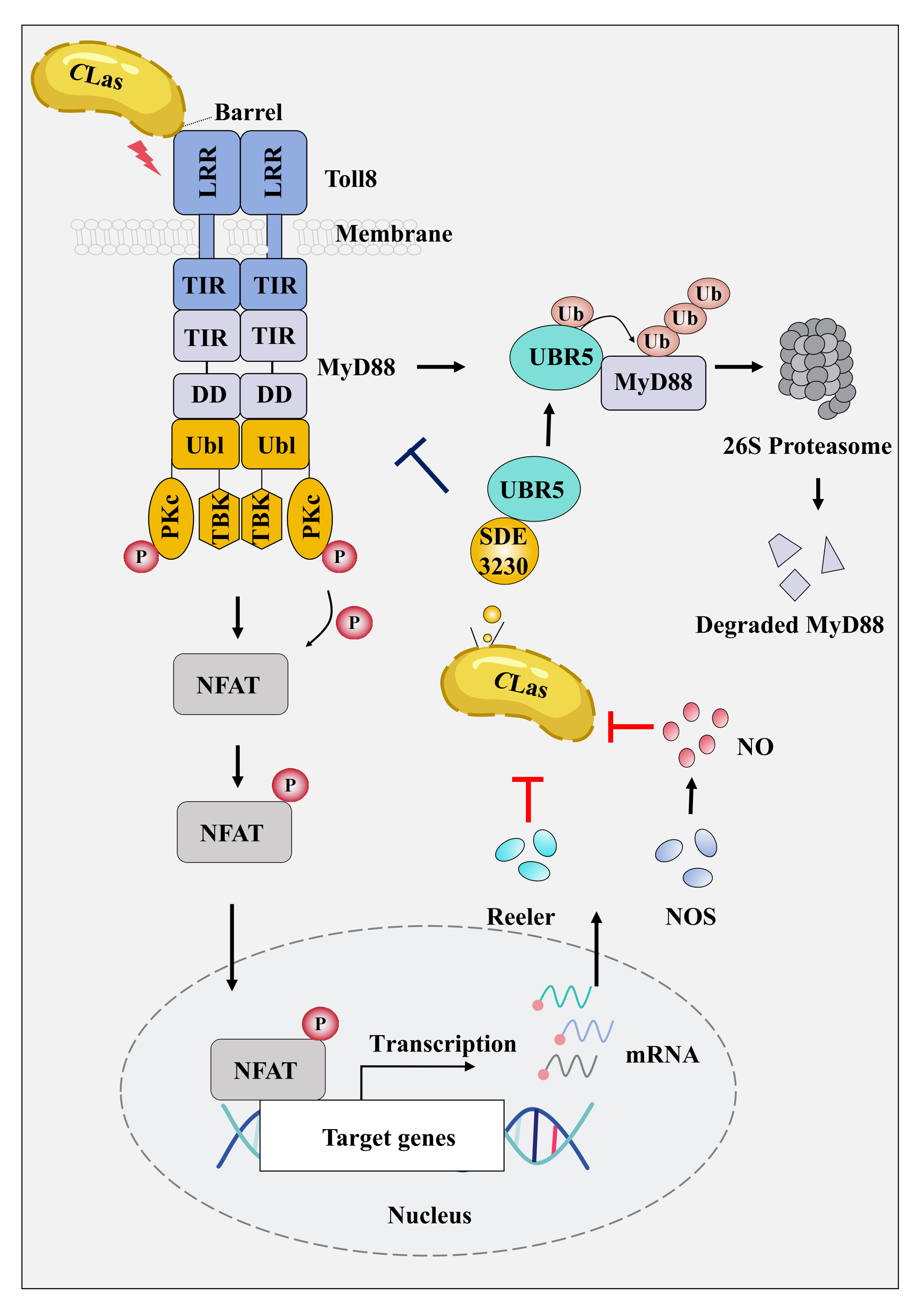 图1. CLas侵染柑橘木虱激活和抑制Toll受体介导的免疫反应的模型