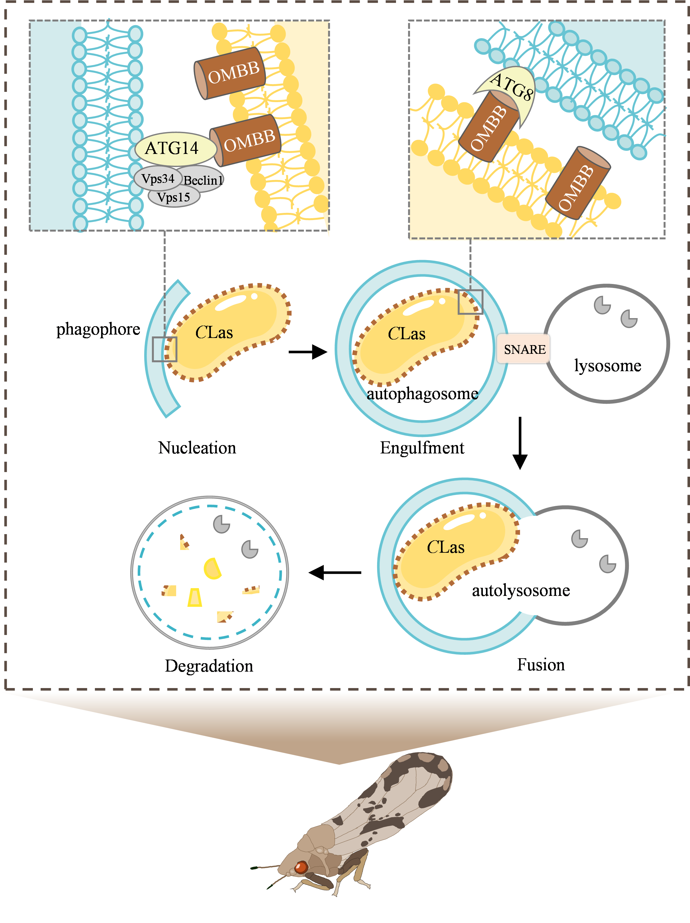 许多生物会利用自噬这一重要的抗菌防御机制来吞噬病原体,然而,对于虫传植物细菌触发自噬的机制,此前却知之甚少。研究发现,CLas侵入柑橘木虱肠道上皮细胞后,会触发巨自噬,包裹CLas颗粒,抑制CLas的侵染。研究还揭示了CLas外膜β桶蛋白(OMBB)作为分泌蛋白,能与ATG14和ATG8互作诱导自噬。但是CLas诱导的自噬是温和的,无法将CLas彻底清除,部分解释了CLas可在柑橘木虱体内持久性侵染的原因。
