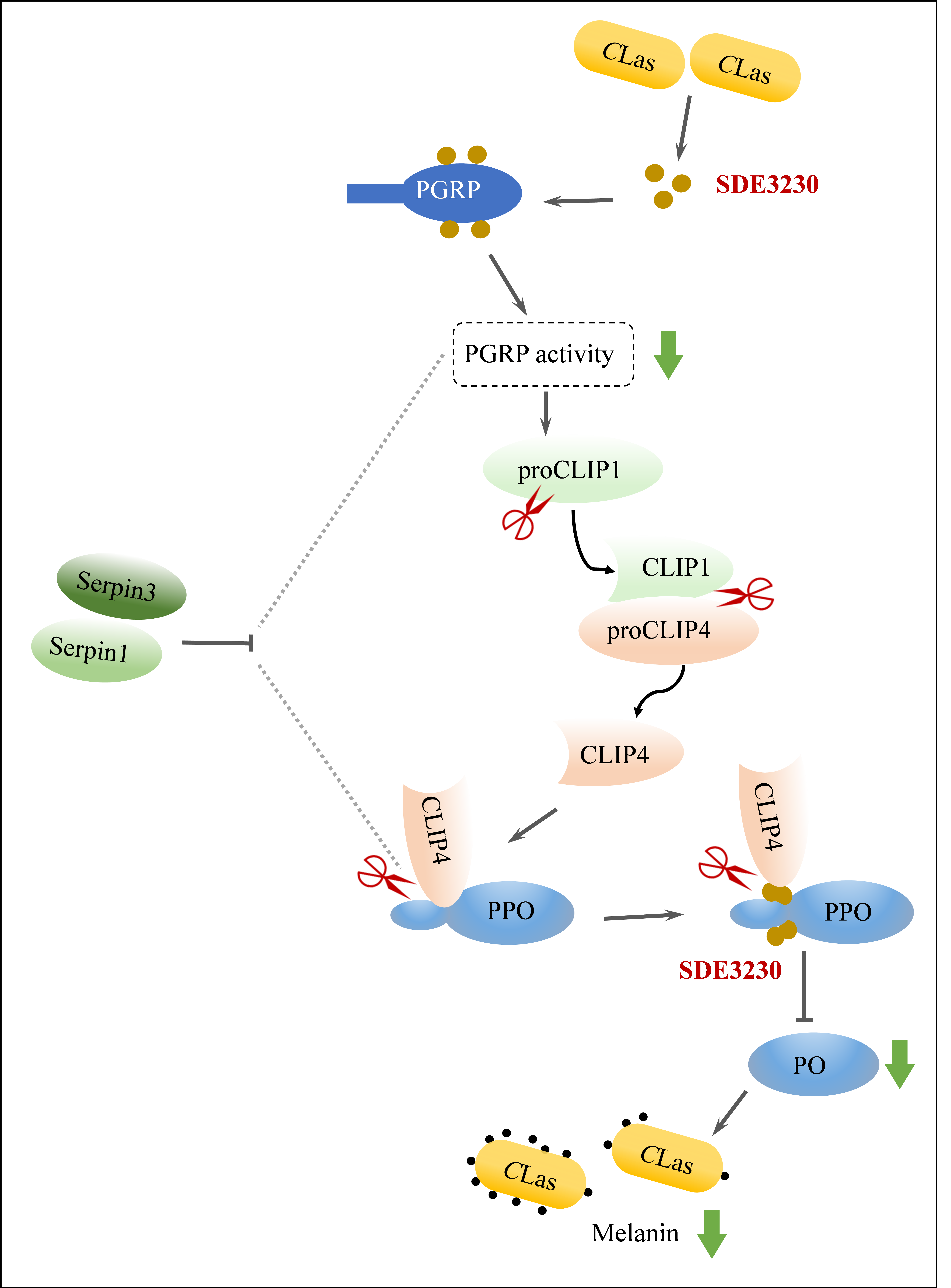 研究发现,CLas侵染柑橘木虱会激活肽聚糖识别蛋白(PGRP)-CLIP1-CLIP4-PPO-PO信号通路,诱发温和的黑化反应,从而在确保昆虫适应度不受显著影响的前提下,实现CLas的持久侵染。CLas编码的分泌蛋白SDE3230能够直接与PGRP互作,并抑制其在该信号通路传导中的活性。CLIP4通过在精氨酸125与甲硫氨酸126残基之间切割PPO以激活PO并诱导黑化。值得注意的是,SDE3230能够与CLIP4竞争性结合PPO的这一切割位点,从而抑制PPO的有效切割。本研究揭示了SDE3230通过双重作用机制调控轻微黑化反应,既有利于CLas的持久感染,又维持了昆虫媒介的适应度。