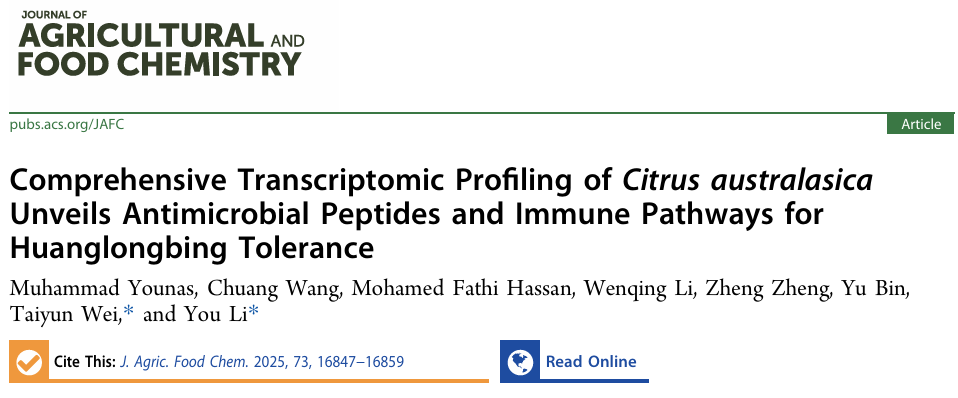 此外,2025年6月11日,团队在Journal of Agricultural and Food Chemistry(农业与食品化学杂志)上发表题为“Comprehensive Transcriptomic Profiling of Citrus australasica Unveils Antimicrobial Peptides and Immune Pathways for Huanglongbing Tolerance”(澳洲指橙的转录组数据揭示抗菌肽及免疫通路对柑橘黄龙病的耐受)的研究论文。该研究通过对抗病柑橘近缘种——澳洲指橙(Citrus australasica)的转录组分析,揭示了CLas免疫响应的可能网络,并从中鉴定出一系列具有显著抗菌活性的植物源抗菌肽(AMPs)。该研究成果为开发基于抗菌肽的环境友好型黄龙病防控新策略奠定了理论基础。