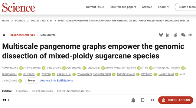 北京时间2026年2月6日凌晨,bat365正版唯一官网研究团队联合广西大学等单位在国际顶级学术期刊Science(《科学》)在线发表了题为“Multiscale pangenome graphs empower the genomic dissection of mixed-ploidy sugarcane species”(多尺度图形泛基因组赋能混合倍性物种甘蔗的遗传解析)的甘蔗基因组学领域最新研究成果。该研究首次提出并实现了面向复杂倍性作物的图形泛基因组框架,系统性破解了长期困扰甘蔗遗传学与育种研究的“基因组迷宫”,为多倍体作物的精准解析与分子育种开辟了全新范式。