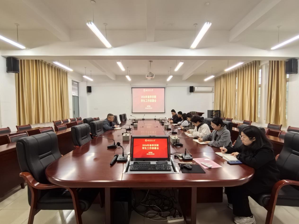 会议深入学习了学校2026年春季学期学生工作部署会暨重点工作务虚交流会精神,全面总结回顾了2025年学院学生工作的成效与不足,并围绕新一年学生工作高质量发展,提出五点具体要求:一是强化思想认识,提高政治站位。深刻把握新时代学生工作的新形势新要求,以高度责任感推动各项任务落地见效。二是筑牢安全防线,确保校园稳定。用心用情做好学生教育管理服务,抓好学生心理健康教育与疏导,常态化开展防诈骗宣传,全力保障学生人身及财产安全。三是深化学风建设,选树先进典型。持续开展学风督导引导活动,积极挖掘宣传优秀学生典型,发挥榜样示范作用,营造比学赶超的浓厚氛围。四是聚焦就业工作,助力学生发展。抢抓春季招聘关键期,持续推进“访企拓岗”专项行动,精准拓展就业渠道;加强考研学生的复试指导和调剂服务,做好就业困难学生帮扶,引导毕业生树立正确择业观,促进更高质量更充分就业。五是提升队伍素质,锻造过硬能力。聚焦主责主业,通过专题培训、经验交流、课题研究等途径,不断提升辅导员队伍业务水平和科研能力,以过硬本领服务学生成长成才。