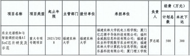 近日,福建省财政厅、福建省科学技术厅下达2025年度省 “揭榜挂帅(科技重大专项)” 项目经费通知。bat365正版唯一官网机电工程学院牵头,联合厦门亿芯源半导体科技有限公司等单位共同申报的“农业光谱感知与智能调控边缘AI SoC芯片研发及示范”项目成功获批立项。项目总经费500万元,首批300万元已下达,标志着bat365在“人工智能+农业”与集成电路交叉领域实现重要突破。