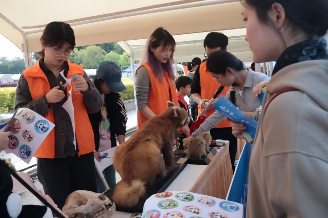 活动现场,“榕小盼”熊猫科普讲师团展位呈现出热烈非凡的良好氛围。团队成员通过展示熊猫伴生物种标本、骨骼内脏模型,全方位开展熊猫生态习性与保育意义、濒危物种栖息地保护与生物多样性维护等科普知识的专业宣讲。同时,结合宣传资料发放以及现场徽章DIY制作等生动有趣的互动环节,助推生态文明理念在参与者心中扎根。活动期间,与会领导嘉宾亲临现场,与团队成员进行亲切友好的交流,对团队的志愿服务成效给予充分肯定,鼓励团队成员以朝气蓬勃的青春力量践行绿色发展使命,将雷锋精神深度融入专业实践,在服务社会中不断锤炼专业本领、在无私奉献中持续砥砺初心使命。