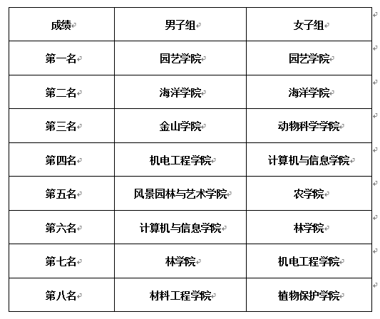 男子组赛场同样精彩纷呈。园艺学院延续强势表现,勇夺冠军,实现了本届运动会男女双冠的辉煌战绩;海洋学院、金山学院分获亚军与季军;机电工程学院、风景园林与艺术学院、计算机与信息学院、林学院、材料工程学院则分列第四至第八名。