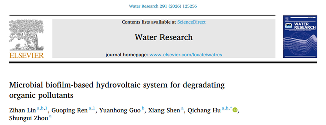 该研究成果以“Microbial biofilm-based hydrovoltaic system for degrading organic pollutants”为题发表于《Water Research》(自然指数期刊,中科院一区TOP,IF=12.4)。