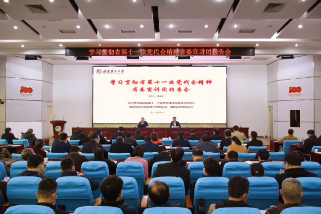 报告会主会场设在金山校区禧强楼学术报告厅,在旗山校区设立分会场。在家校领导、学校中层干部、师生代表600多人听取报告。省委宣传部二级调研员陈良胜、省文物局综合处干部张祖城、省文旅厅党史学习教育办公室干部王乾坤莅临指导。