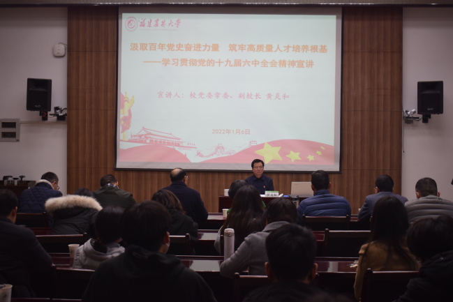 1月6日上午,校党委常委、副校长林庆藩作题为《深入学习贯彻党的十九届六中全会和省第十一次党代会精神》的宣讲报告。林庆藩在概述党的十九届六中全会和省第十一次党代会基本情况的基础上,阐明建党百年这一重要历史时刻总结党的百年奋斗重大成就和历史经验的重大意义,从三个需要、四个伟大飞跃,十三个方面总结新时代历史性成就和变革,十个“坚持”总结百年奋斗的历史经验等方面进行了详细阐述。同时,他对新发展阶段新福建建设的总纲领、总体要求、工作重点进行全面系统阐述。林庆藩要求与会人员把思想和行动统一到大会作出的决策部署上来,学以致用、知行合一,把全会精神贯穿到学校“十四五”和“双一流”建设各项工作谋划和推进落实中,立足本职岗位,紧紧围绕校党委决策部署,砥砺前行,实干担当,在新征程上展现新作为。