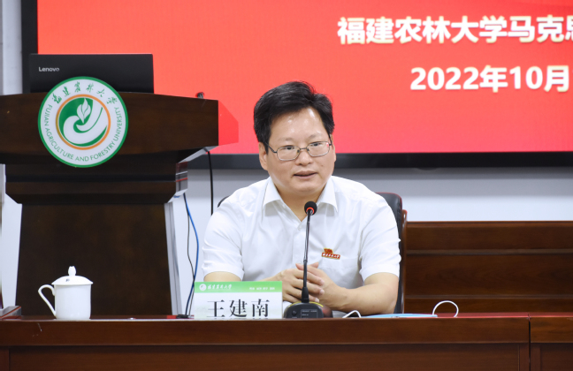 王建南强调,马克思主义学院要把学习宣传贯彻党的二十大精神作为当前和今后一个时期的首要政治任务,着力在学习领会、正确把握、研究阐释、宣传解读上下功夫,在推进习近平新时代中国特色社会主义思想进教材进课堂进学生头脑上下功夫,引领广大师生把思想和行动统一到党的二十大精神上来。要善用菌草故事、红色资源和习近平总书记在福建的探索实践建设“大思政课”,让思政课有理有据、有根有魂,讲深历史大课、讲透理论大课、讲活情怀大课,坚定青年学子听党话、跟党走,既怀抱梦想又脚踏实地,既敢想敢为又善作善成,立志做有理想、敢担当、能吃苦、肯奋斗的新时代好青年。