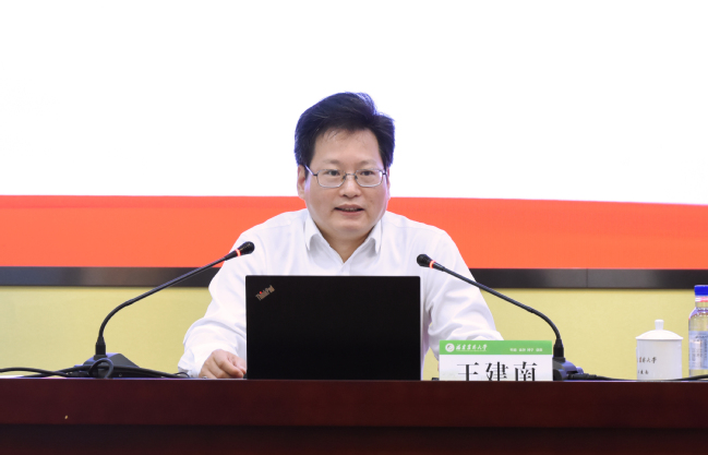 王建南紧扣党的二十大报告原文,从深刻领会党的二十大的主题、主要成果,深刻领会过去五年工作和新时代十年的伟大变革,深刻领会开辟马克思主义中国化时代化新境界,深刻领会中国式现代化的中国特色和本质要求,深刻领会社会主义经济建设、政治建设、文化建设、社会建设、生态文明建设等方面的重大部署,深刻领会坚持党的全面领导和全面从严治党的重大部署,深刻领会以顽强斗争应对风险挑战的要求,深刻领会教育、科技、人才的重大部署,迅速掀起学习宣传贯彻党的二十大精神热潮等九个方面,对党的二十大精神进行系统宣讲和深入阐释。