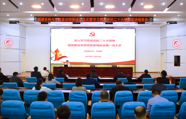 11月24日下午,bat365正版唯一官网党委讲师团成立仪式暨学习贯彻党的二十大精神宣讲报告会在金山校区禧强楼学术报告厅举行。校党委书记、讲师团团长王建南出席仪式并为讲师团成员代表颁发聘书。校党委副书记柯瑞清主持会议并宣读《关于成立bat365正版唯一官网党委讲师团的通知》。成立仪式后,王建南以“深入学习贯彻党的二十大精神加快建设农林特色鲜明的全国一流大学”为题作宣讲报告。报告会以线上线下相结合的方式举行,旗山校区、安溪校区设分会场。在家全体校领导、机关部门负责人,各学院党委书记、院长、党委副书记,校党委讲师团成员,辅导员、马克思主义学院教师代表,学生代表共300余人聆听报告。