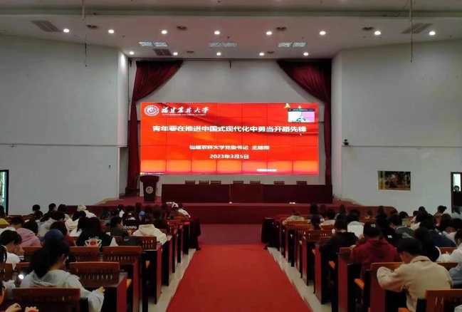3月5日上午,校党委书记王建南以“青年要在推进中国式现代化中勇当开路先锋”为题,通过线上线下相结合的方式为青年师生讲授“开学第一课”,主会场设在金山校区常盛学术会议中心,旗山校区和安溪校区设分会场。习近平新时代中国特色社会主义思想大学生研习社成员、马克思主义专业硕士研究生、部分博士研究生和辅导员等青年师生600多人参加了学习。