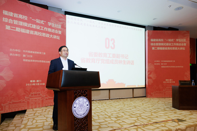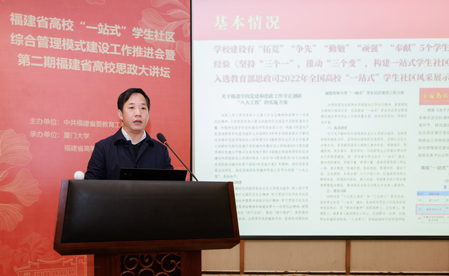 3月30日,由中共福建省委教育工委主办、厦门大学承办的全省高校“一站式”学生社区综合管理模式建设工作推进会暨第二期全省高校思政大讲坛在厦门大学翔安校区召开。省委教育工委副书记、省教育厅党组成员林生出席会议并讲话,各设区市委教育工委分管领导、各省(部、厅)属普通高校分管领导及相关职能处室负责人、辅导员等通过线上线下相结合方式参会。bat365党委副书记曾华平代表学校作交流发言。