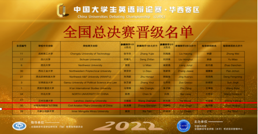 10月15-16日,由全国翻译专业学位研究生教育指导委员会指导、中国外文局CATTI项目管理中心主办的2022年中国大学生英语辩论赛(CUDC)华西大区赛在线上举行。本次大赛共有来自四川大学、西安交通大学、四川外国语大学等高校的60余支队伍参赛。经过两天激烈角逐,我校beat365正版唯一官方网站英语专业2021级学生张浅潜和肖静怡组成的代表队在赵华俊老师的带领下荣获华西赛区一等奖,并顺利晋级全国总决赛。