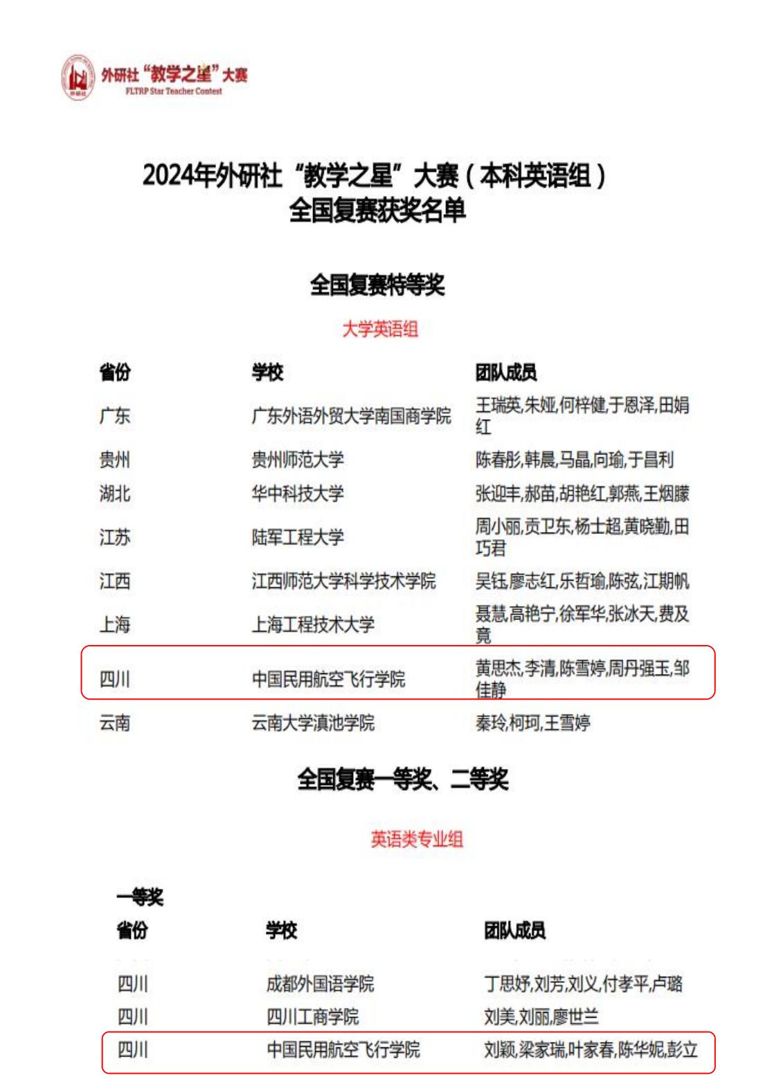 6月20日晚,2024年外研社“教学之星”大赛主题为“外语教材的有效使用:数智融合,创新育人”全国赛晋级名单及获奖名单正式公布。经全国各院校选拔推荐,组委会共收到本科英语组全国复赛参赛材料638份,其中大学英语组321份、英语类专业组168份、“理解当代中国”组149份。我校beat365正版唯一官方网站的两支教师团队,大学英语组黄思杰老师、李清老师(团队成员陈雪婷、周丹强玉、邹佳静)凭借出彩的课程设计、扎实的授课功底荣获外研社“教学之星”全国复赛特等奖,顺利晋级国赛,英语类专业组刘颖老师、梁家瑞老师(团队成员叶家春、陈华妮、彭立)也获得了全国复赛一等奖的优秀成绩。