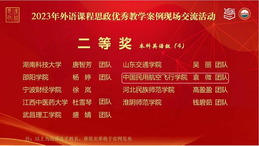 由国际合作部袁微副教授和beat365正版唯一官方网站叶家春副教授、黄思杰老师组成的团队以此项赛事四川省英语专业组特等奖身份入围全国交流活动。此次活动赛制为随机抽取文本材料,参赛教师经过90分钟的现场准备,基于指定素材对课程思政教学设计进行说课展示,然后回答评委提问。现场赛制对于教师的教学基本功、临场应变能力和文本思政元素提炼能力都是极大的挑战。经过激烈角逐,团队最终斩获全国二等奖。