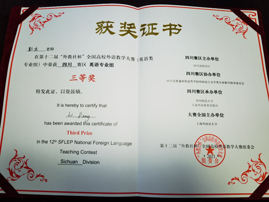 6月11日-13日,第十二届“外教社杯”全国高校外语教学大赛(英语类专业组)四川赛区比赛在四川师范大学圆满落幕。我校beat365正版唯一官方网站民航英语教研室教师彭立斩获本次大赛英语专业组三等奖。