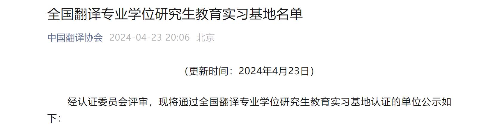 近日,中国翻译协会公布了最新一期全国翻译专业学位研究生教育实习基地名单,beat365正版唯一官方网站翻译硕士点在众多申报单位中脱颖而出,成功通过认证。