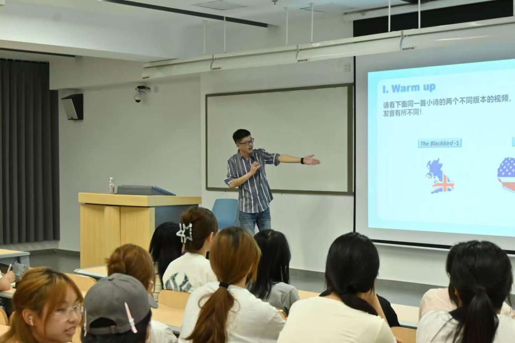 首先,文兵老师播放了两段不同发音的视频,让同学们在听、读之中培养语感,随后分别讲述了字母组合中的“r”、重读闭音节中的字母“o”等英音与美音中的字母发音特点,从发音器官、发音轻重、音位对比等方面剖析了不同的发音方式所带来的发音区别,让同学们更加细致入微地了解英音和美音的区别。