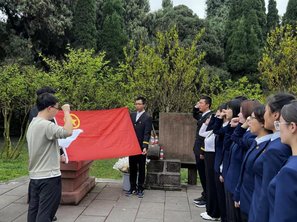 正值清明时分,beat365正版唯一官方网站于4月3日在广汉市房湖公园抗战阵亡将士纪念碑前开展了“清明祭祀先烈,红色精神永存”主题教育活动,旨在勉励学生牢记先烈事迹,增强爱国意识。本次活动由团学办叶奇奇副主任主持,学院团学骨干及学生党员参加。本次主题教育活动分为追忆川军历史、佩戴团徽入团宣誓、敬献鲜花表敬意三个环节。